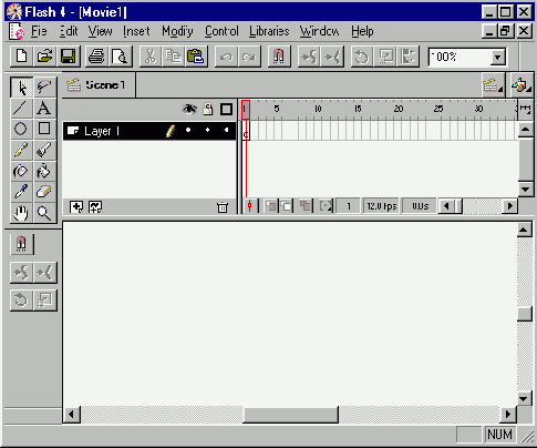 Итак, давайте, наконец прекратим пустую болтовню и запустим Flash. То, что появляется на экране после запуска должно слегка напоминать вот эту вот картинку.