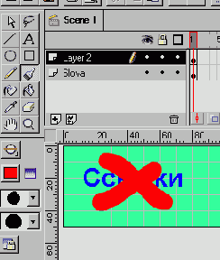 Давайте будем для простоты в дальнейшем называть эту область нерусским ругательным словом "Тайм-лайн" (синий прямоугольник появился с том месте куда я ткнулся мышкой :). Как легко заметить она состоит из нескольких слоев (Layer), причем в каждом горизонтальном слое есть место для множества кадров. В нашем случае мы используем один единственный кадр (он обозначен черным кружком) в слое под названием Layer 1. Давайте два раза щелкнем мышкой на названии нашего слоя и заменим "Layer 1" на что-то более понятное например "Slova". Значок карандаша справа от названия слоя говорит о том мы рисуем или создаем объекты именно в этом слое. Чтобы жизнь не казалась медом давайте тыкнемся мышкой в белый прямоугольник со знаком "плюс" чуть ниже названия слоя. После этих действий картина должна слегка измениться