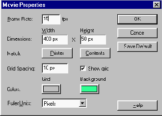 Вот эта вот белая область в центре рисунка это как раз то место где располагаются всяческие рисунки, и все остальное, что будет видно доверчивым и беззащитным посетителям вашей домашней странички. Только что-то эта область как-то великовата и вообще слишком квадратная какая-то... Ради такого случая давайте сходим в раздел меню Modify/Movie и вот в этом окошке